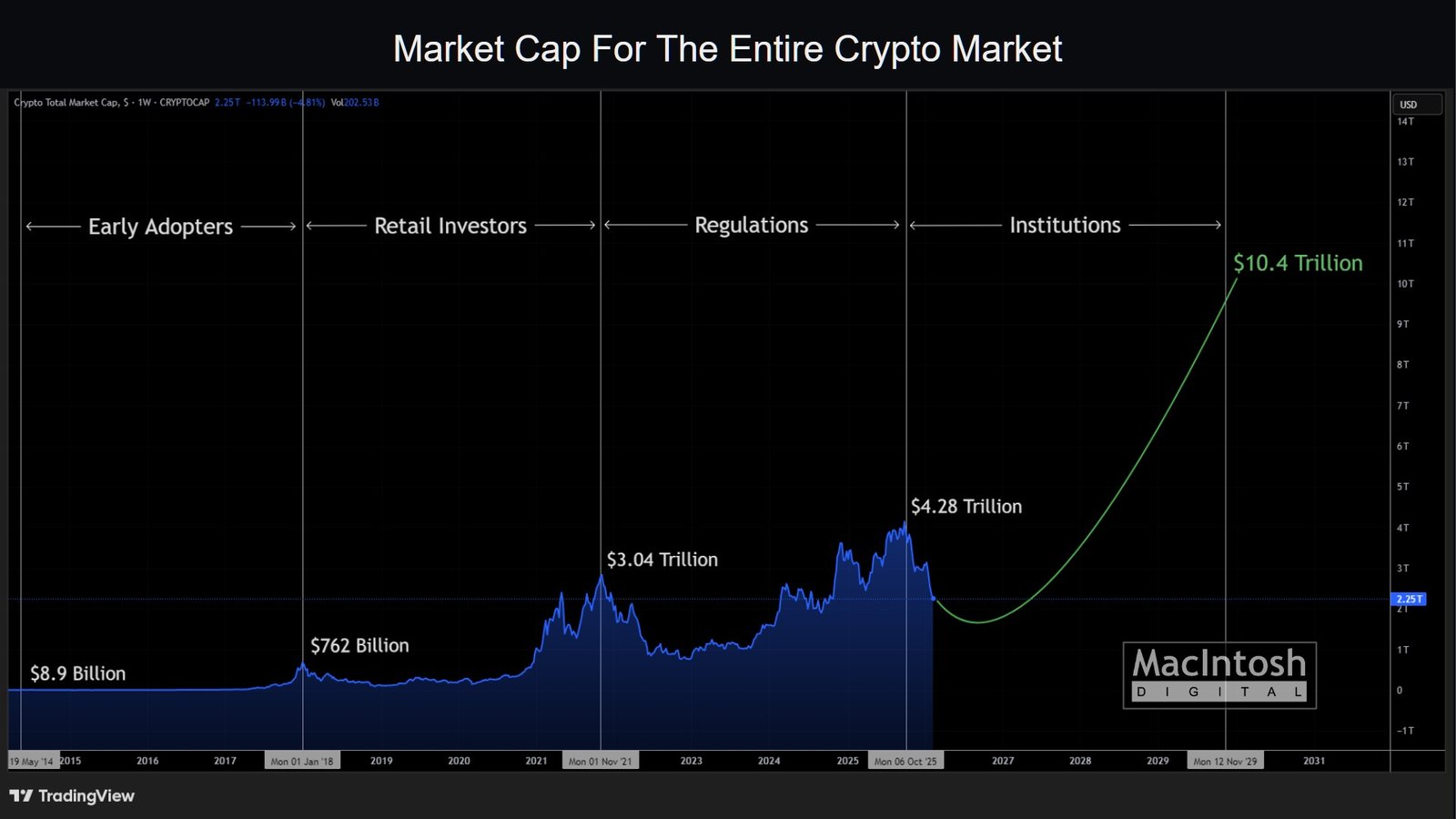 Major asset managers like BlackRock, Fidelity, VanEck, and others have been promoting Bitcoin and Ethereum through their ETF products. New ETF applications are unlocking access to the altcoin market for traditional investors. Government legislation is paving the way for banks to enter the crypto space so they can offer trading, custody and lending services to their clients making it easier for individuals, corporations and governments to invest in cryptocurrency. As this rolls out, we are targeting the $10.4 trillion range as the baseline to measure token price potential for the near future.